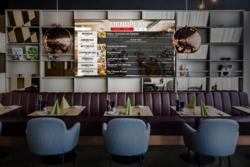 Die Menüs lassen sich mit Ihrem Firmenlogo und Ihren Firmenfarben individualisieren und so in Ihren bestehenden Auftritt integrieren. Neben der Ausgabe über die Bildschirme ist es auch möglich, mit nur einem Klick eine